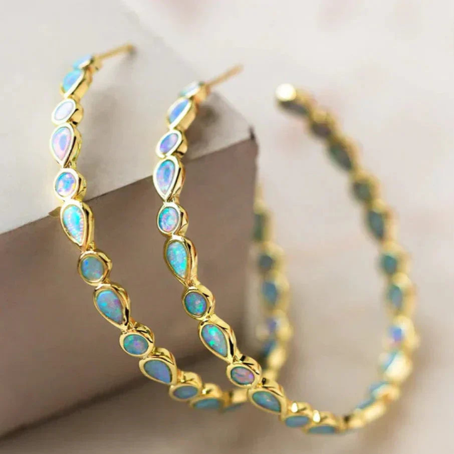 Emmeline - Vintage Blue Opal Golden Hoop Earrings
